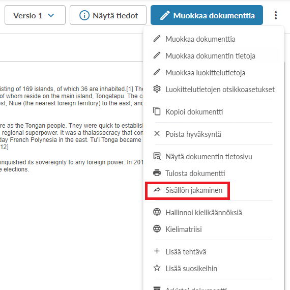 1. Mene dokumentille jonka haluat jakaa ja avaa toiminnot (ikoni: kolme pistettä). Valitse "sisällön jakaminen"